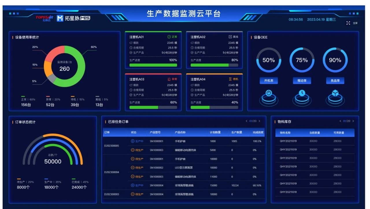 “深度MES的配置,周期长,难度大,成本高,是近年来企业管理信息化遇到的瓶颈。这个过程在注塑企业导入信息化系统时往往被忽视,最终导致信息管理看板成了摆设,针对发展程度不同的企业需要有更灵活的MES方案。”杨靖介绍道。因此,我们研发更加轻量化、低成本的拓星脉MES系统和IoT数字平台,通过按需采集制造过程中的物理数据,灵活满足管理需求和各系统数据,实现车间制造成本控制、生产经营过程透明、装备和产品信息集成,并配置本地化数据服务器,电脑、平板、手机等多样终端,为企业打造制造协同管理平台,准确把控生产过程。